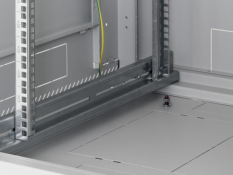 Szersze szyny w korpusie szafy przeznaczone są do dodatkowego montażu 19" paneli zarządzania zasilaniem, które następnie nie zajmują miejsca w szafie