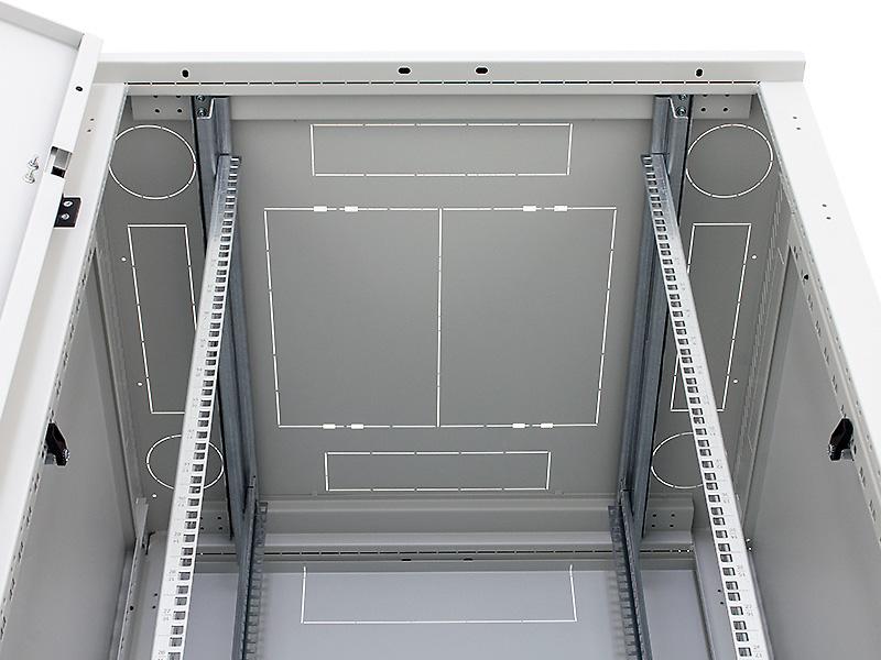 Szersze szyny w korpusie szafy przeznaczone są do dodatkowego montażu 19" paneli zarządzania zasilaniem, które następnie nie zajmują miejsca w szafie